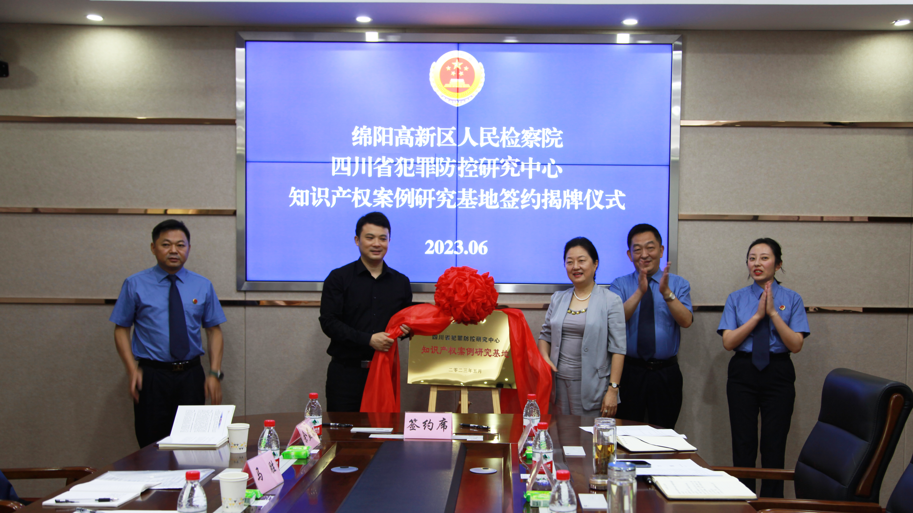 绵阳市人民检察院党组副书记(主持常务工作)副检察长王佼、绵阳高新区人民检察院党组书记、检察长景中强、四川省犯罪防控研究中心主任廖天虎共同为基地揭牌